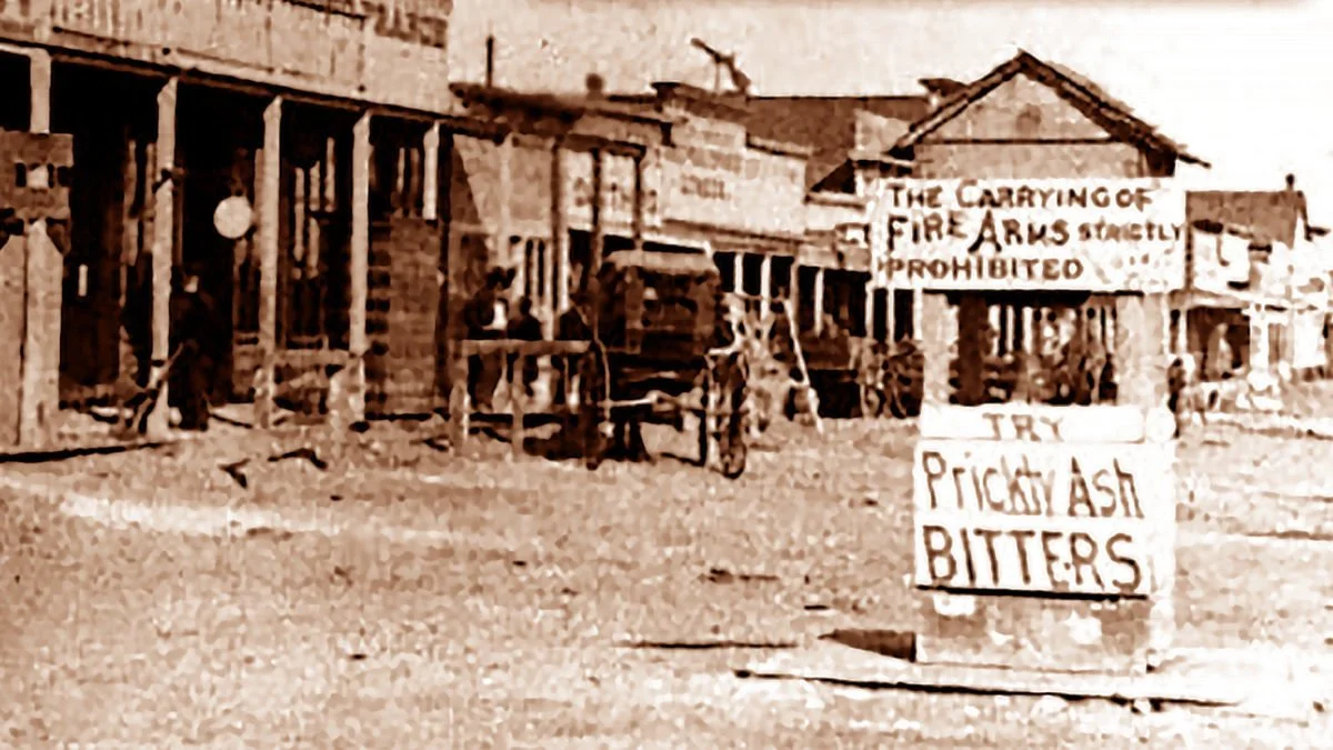 Image of al old frontier town with the gun control ordinance clearly posted: “The Carrying of Fire Arms Strictly Prohibited.” Courtesy Saint Joseph’s University